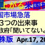 米国株の株式投資情報。米国市場を急落させた3つの出来事。日本政府「聞いてないよ~」大丈夫か!?~あす上がる株米国版。Apr.17, 2025。最新のアメリカ株価と株式投資。高配当株やデイトレ情報も