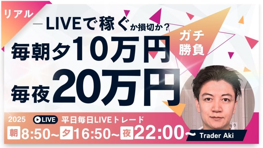 毎夜20万円・毎朝夕10万円稼げるか?にしばらく挑戦!必ず10万円プラスかマイナスになるまでやる!トレーダーAkiのライブトレード配信。リハビリ中です。スキャ&デイトレ 平日平常時は8時50分頃~仲値頃まで、16:50時頃から1時間、22:00頃~2時間、相場分析をしながらトレードします。チャット欄では自由に交流してください。