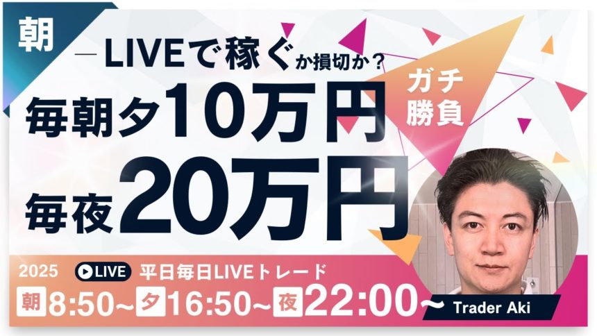 毎朝10万円稼げるかしばらく挑戦!10万円プラスかマイナスになるレベルのロットで挑戦しますが10:30までに達成できない場合はごめんなさい!リハビリ中です。トレーダーAkiのライブトレード配信。スキャ&デイトレ 平日平常時は8時50分頃~仲値頃まで、16:50時頃から1時間半、22:00頃~3時間、相場分析をしながらトレードします。チャット欄では自由に交流してください。