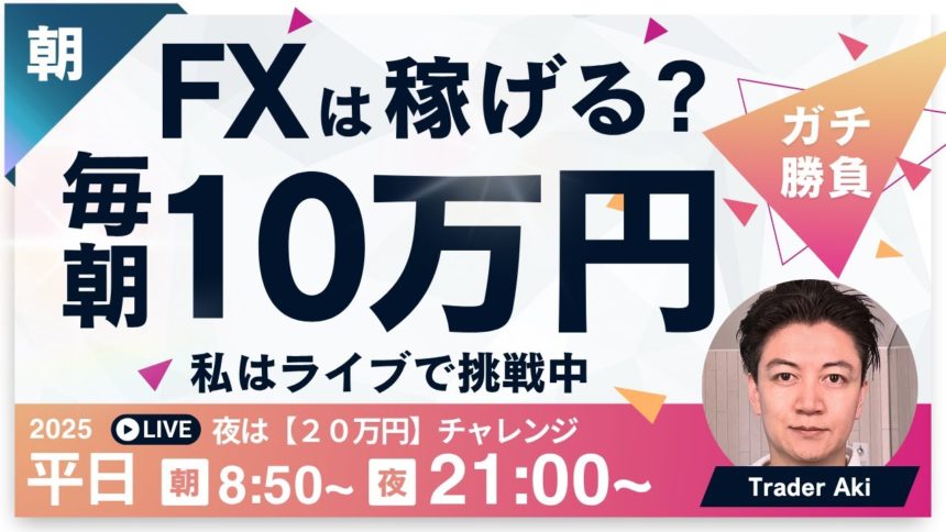 朝トレ配信!毎朝10万円・毎夜20万円稼げるか?に挑戦中!目標額プラスかマイナスになるレベルのロットで挑戦しますが配信終了時までに達成できない場合はごめんなさい!リハビリ中です。トレーダーAkiのライブトレード配信。スキャ&デイトレ 平日平常時は8時50分頃~仲値頃まで、夜は21:00頃~3時間、相場分析をしながらトレードします。チャット欄では自由に交流してください。