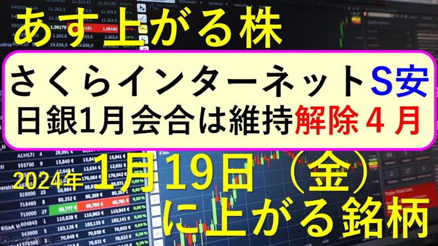 今日の引け後に出た材料で、あす1/19(金)に期待できる銘柄。最新の日本株での株式投資のお話です。さくらインターネットがストップ安、日銀の1月金融政策決定会合は維持の見通し、マイナス金利を解除するタイミングは4月についてもお話しいたします。