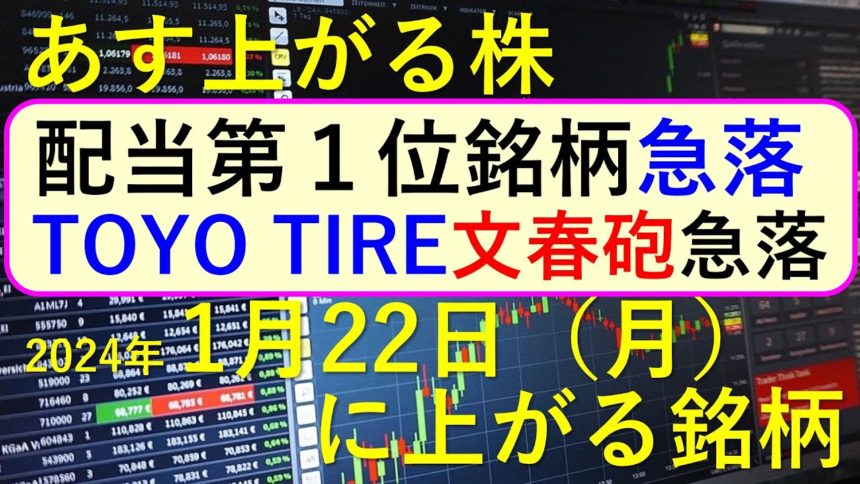 今日の引け後に出た材料で、週明け1/22(月)に期待できる銘柄。最新の日本株での株式投資のお話です。TOYO TIREが文春砲で急落、配当第利回り1位のトップ銘柄が急落、さくらインターネットの続報についてもお話しいたします。