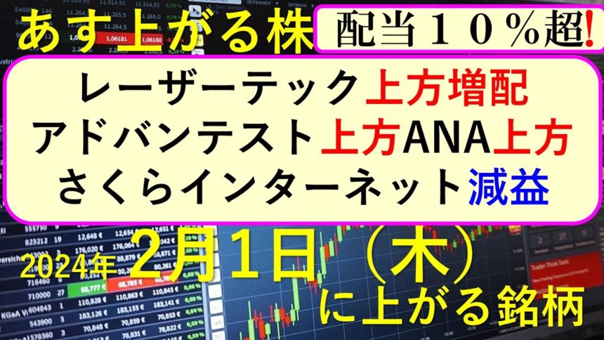 今日の引け後に出た材料で、あす2/1(木)に期待できる銘柄。最新の日本株での株式投資のお話です。レーザーテック、アドバンテスト、さくらインターネット、ANA、東電、JR東、りそなの決算速報についてもお話しいたします。