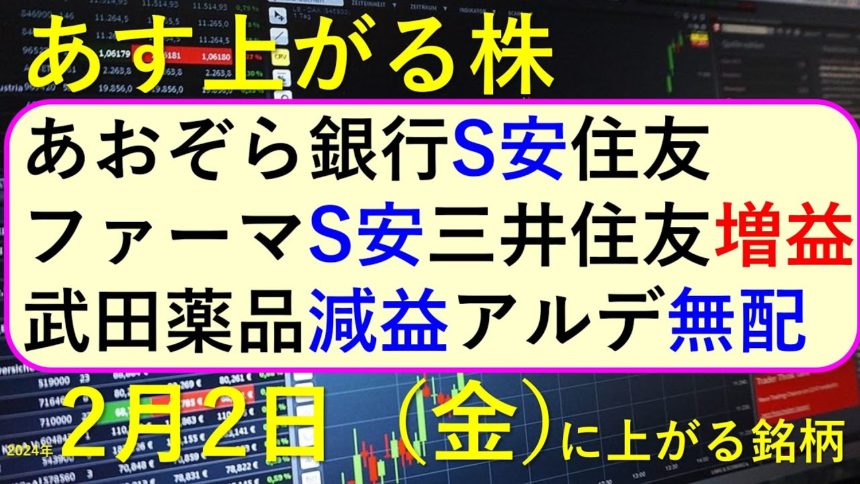 今日の引け後に出た材料で、あす2/2(金)に期待できる銘柄。最新の日本株での株式投資のお話です。三井住友FG、武田薬品、イビデン、中外製薬、ローム、京セラ、三菱自動車、あおぞら銀行、住友ファーマ、アルデプロ、エムスリーの決算速報についてもお話しいたします。