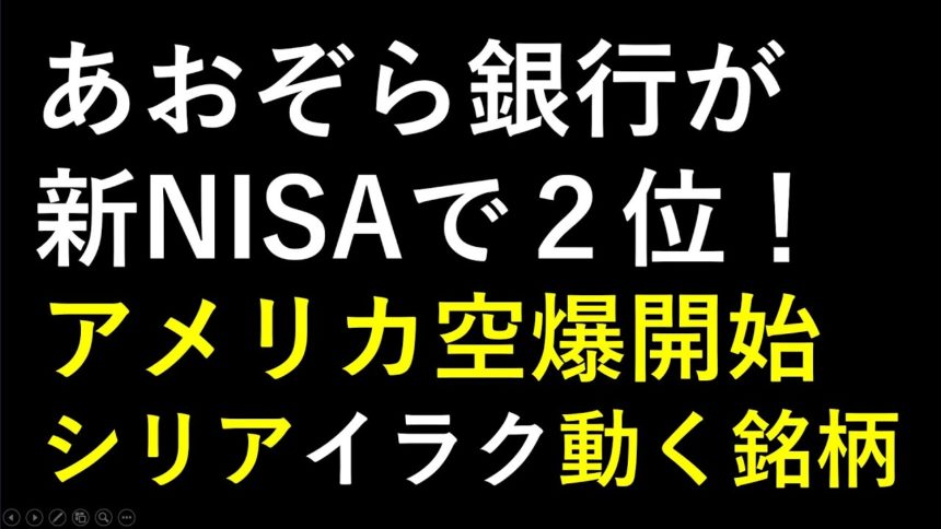 あおぞら銀行が新NISAのランキングで2位になった件と、今朝発表された米軍のシリア・イラクへの報復空爆ついて、週明け2月5日(月)に上げると予測される銘柄についてお話しいたします。