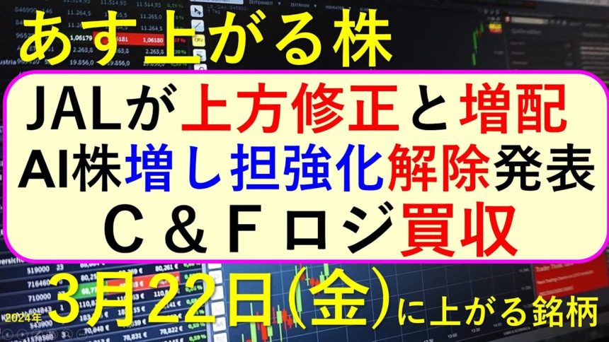 今日の引け後に出た材料で、あす3/22(金)に期待できる銘柄。最新の日本株での株式投資のお話です。JAL(日本航空)が上方修正と増配、C&Fロジホールディングスの買収、AI株で増し担強化と解除が大量発生、NVIDIA連騰についてもお話しいたします。