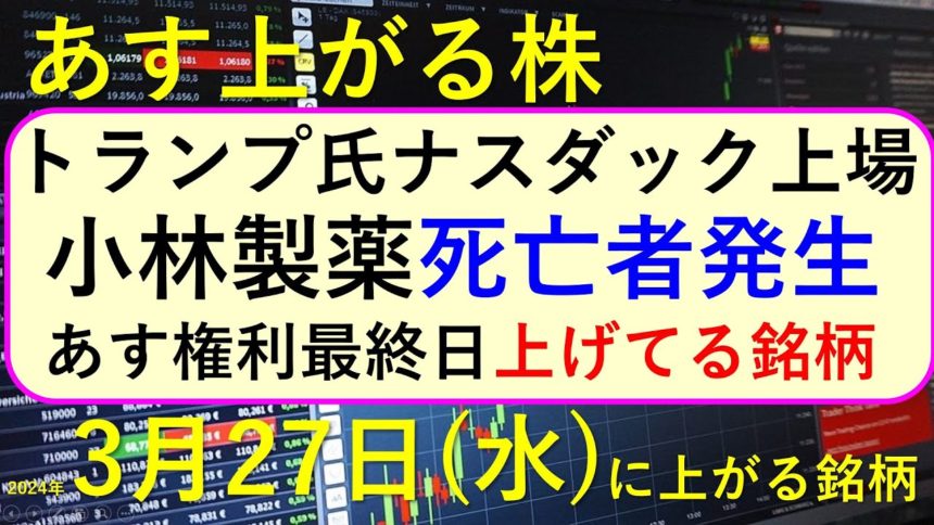 今日の引け後に出た材料で、あす3/27(水)に期待できる銘柄。最新の日本株での株式投資のお話です。小林製薬が紅麹サプリで自主回収から死亡者。死者の発生報道と株価の推移。トランプ氏がナスダックに上場。あす権利最終日についてもお話しいたします。