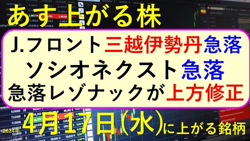 今日の引け後に出た材料で、明日4/17(水)に期待できる銘柄。最新の日本株での株式投資情報です。イスラエルがイランに報復の意向。J.フロントリテイリング、三越伊勢丹、ソシオネクスト、霞ヶ関キャピタルが急落、富士石油、レゾナックの決算と株価の推移についてもお話しいたします。