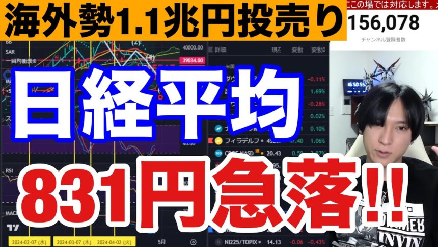 4/25、日経平均急落ヤバい!!海外勢が日本株を1兆1000億円大量売却‼日銀決定会合控えドル円155円に上昇で待ったなし。米国株、ナスダック、半導体株もMETA暴落キツイ。仮想通貨ビットコイン下落。
