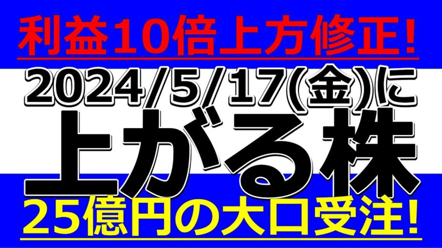 2024/5/17(金)に株価が上がる株、株式投資・デイトレの参考に。利益10倍上方修正!25億円の大口受注!