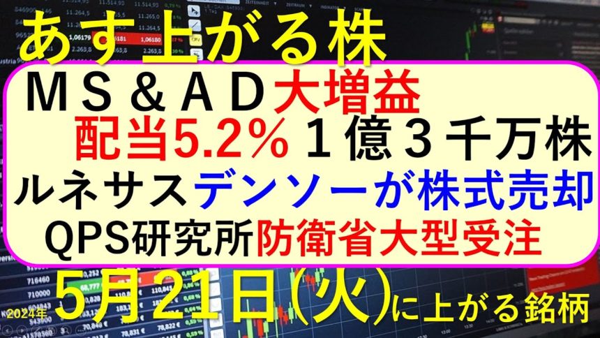 今日の引け後に出た材料で、あす5/21(火)に期待できる銘柄。MS&AD、東京海上、SOMPOの決算。日本KFCのTOB。ルネサス株をデンソーが売却。QPS研究所の受注~最新の日本株での株式投資。高配当株やデイトレ情報についてもお話しいたします。