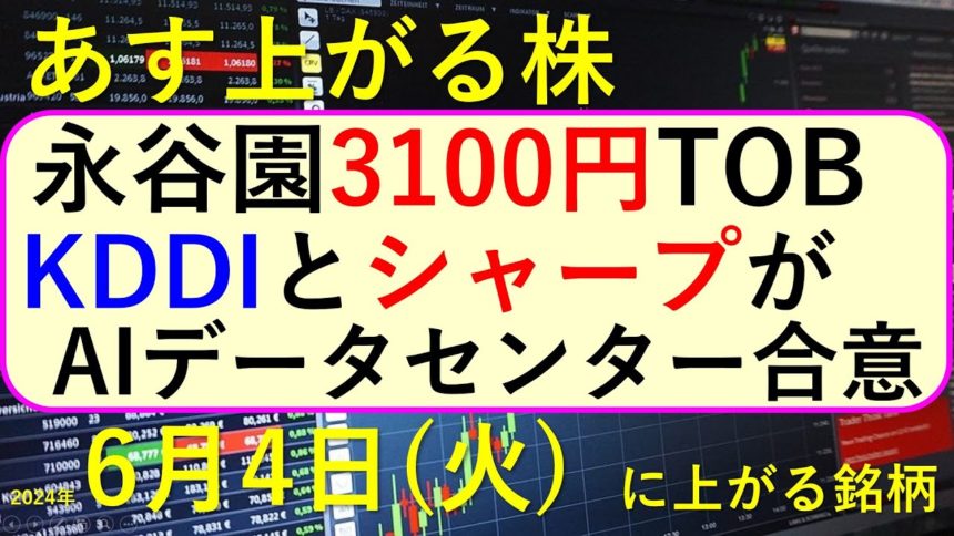今日の引け後に出た材料で、明日6/4(火)に期待できる銘柄。KDDIとシャープ、データセクションがAIデータセンターで合意。永谷園がNBO~最新の日本株での株式投資。高配当株やデイトレ情報ついてもお話しいたします。