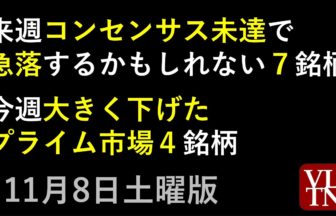 2. 来週コンセンサス未達で急萜するかもしれない銘柄。今週倧きく䞋げたプラむム垂堎銘柄。11月8日土曜版。あす䞊がる株最新の日本株情報。高配圓株の株䟡やデむトレ情報