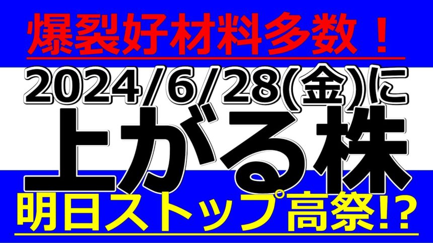 2024/6/28(金)に株価が上がる株、株式投資・デイトレの参考に。爆裂好材料多数!明日ストップ高祭!?