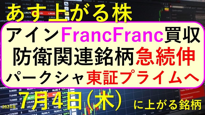 今日の引け後に出た材料で、明日7/4(木)に期待できる銘柄。FrancFrancをアインが買収。パークシャ東証プライムへ。防衛関連株がトランプ有利で急続伸~最新の日本株情報。高配当株やデイトレ情報についてもお話しいたします。