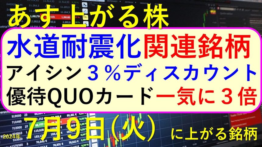 今日の引け後に出た材料で、明日7/9(火)に期待できる銘柄。水道耐震化の関連銘柄。アイシン株の売り出し価格が決定。ウエルシアとフジの決算と株価~最新の日本株情報。高配当株やデイトレ情報についてもお話しいたします。