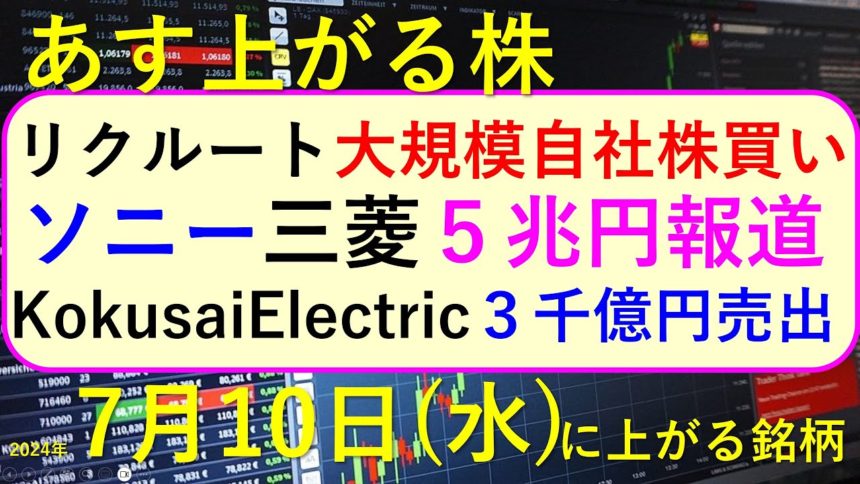 今日の引け後に出た材料で、明日7/10(水)に期待できる銘柄。リクルートの自社株買い、ソニーと三菱電機の5兆円投資。KokusaiElectricの株式売り出し。ENECHANGEが有報提出。~最新の日本株情報。高配当株やデイトレ情報についてもお話しいたします。