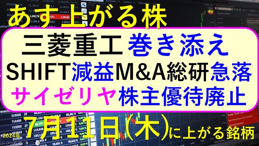 今日の引け後に出た材料で、明日7/11(木)に期待できる銘柄。三菱重工が調査対象。SHIFTの決算は減益。サイゼリヤが決算で株主優待を廃止~最新の日本株情報。高配当株の株価やデイトレ情報についてもお話しいたします。