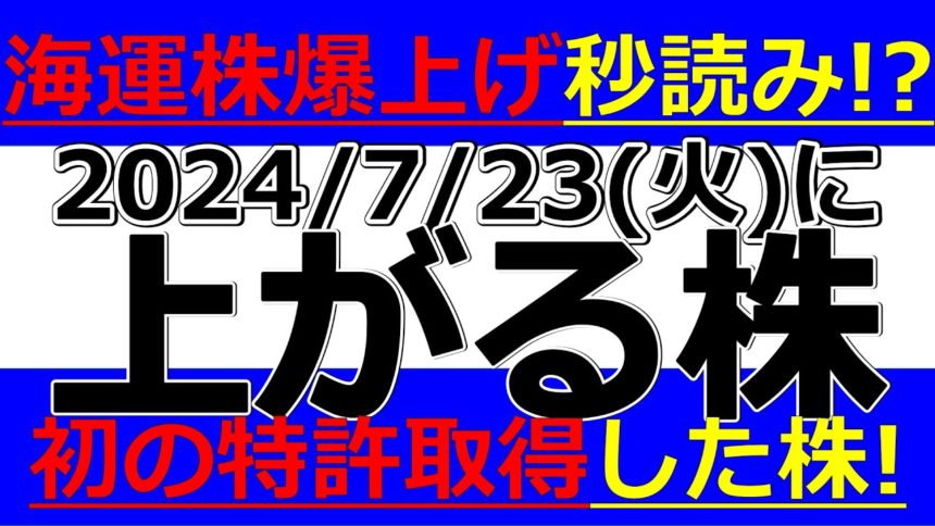 2024/7/23(火)に株価が上がる株、株式投資・デイトレの参考に。海運株爆上げ秒読みか!?初の特許取得した株!