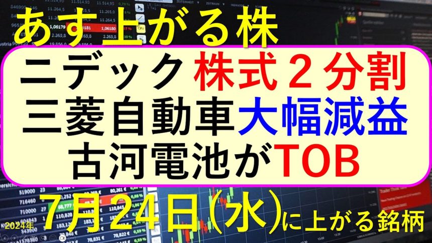 今日の引け後に出た材料で、明日7/24(水)に期待できる銘柄。ニデックが決算で株式分割。三菱自動車とKOAが減益。古河電池がTOB。良品計画が値上げで上昇。~最新の日本株情報。高配当株の株価やデイトレ情報についてもお話しいたします。