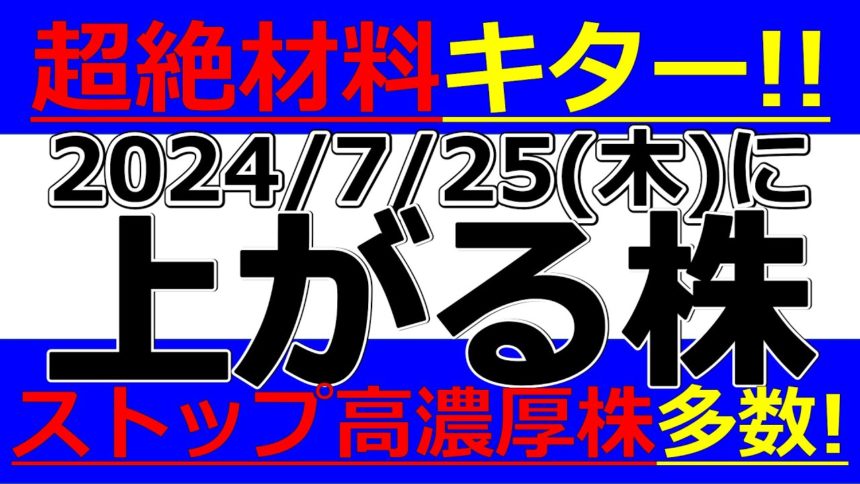 2024/7/25(木)に株価が上がる株、株式投資・デイトレの参考に。超絶材料キター!!ストップ高濃厚株多数!