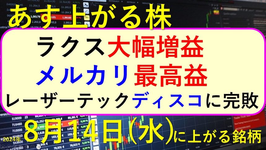 あす上がる株 2024年8月14日(水)に上がる銘柄。ラクス、メルカリ、セルシード、海帆、サイボウズの決算。レーザーテックがディスコに完敗~最新の日本株情報。高配当株の株価やデイトレ情報も~