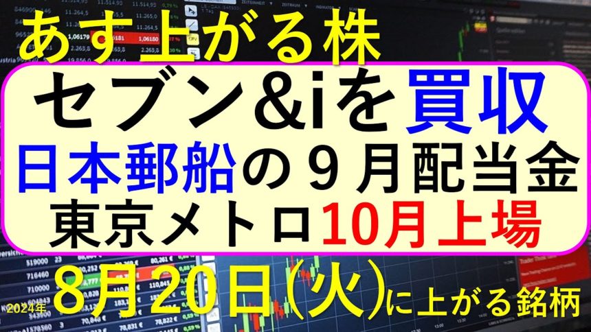 今日の引け後に出た材料で、週明け8/20(火)に期待できる銘柄。セブン&アイの買収。日本郵船の9月配当金。東京メトロが10月末に上場。~最新の日本株情報。高配当株の株価やデイトレ情報についてもお話しいたします。
