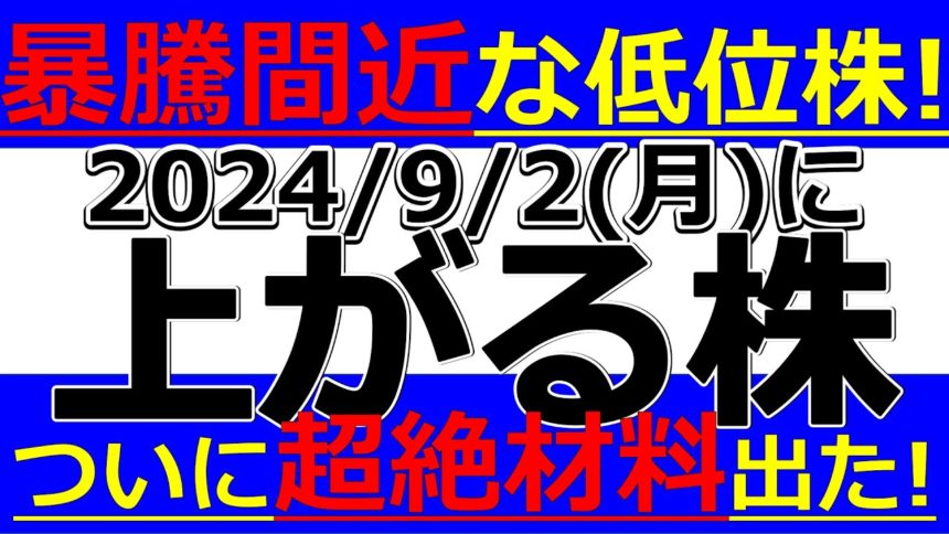 2024/9/2(月)に株価が上がる株、株式投資・デイトレの参考に。暴騰間近な低位株!ついに超絶材料出た!
