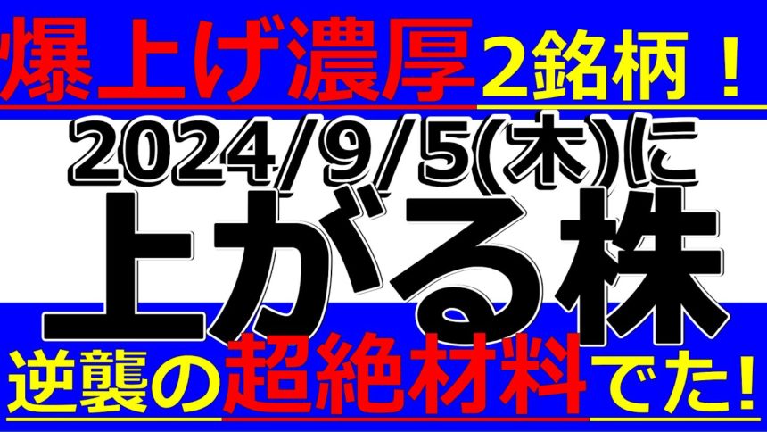 2024/9/5(木)に株価が上がる株、株式投資・デイトレの参考に。爆上げ濃厚2銘柄!逆襲の超絶材料でた!