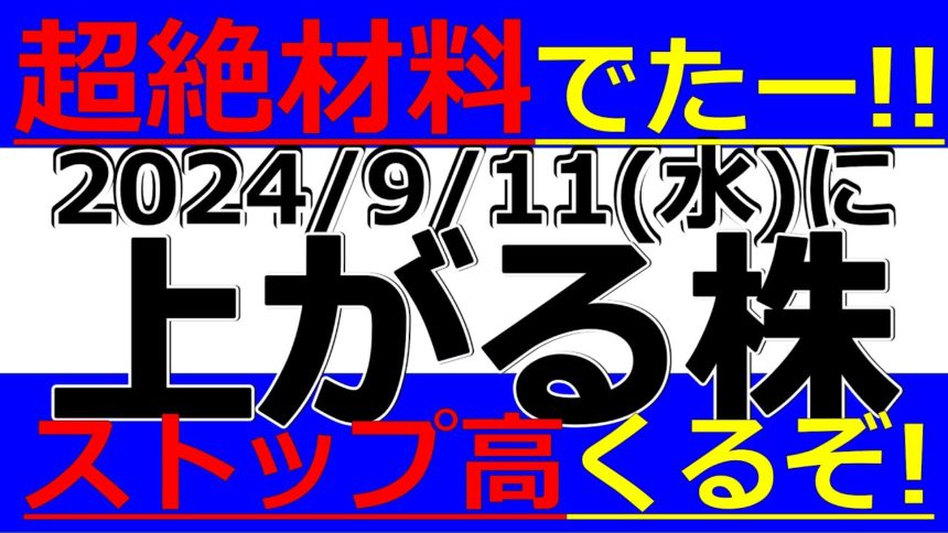 2024/9/11(水)に株価が上がる株、株式投資・デイトレの参考に。超絶材料でたー!!ストップ高くるぞ!