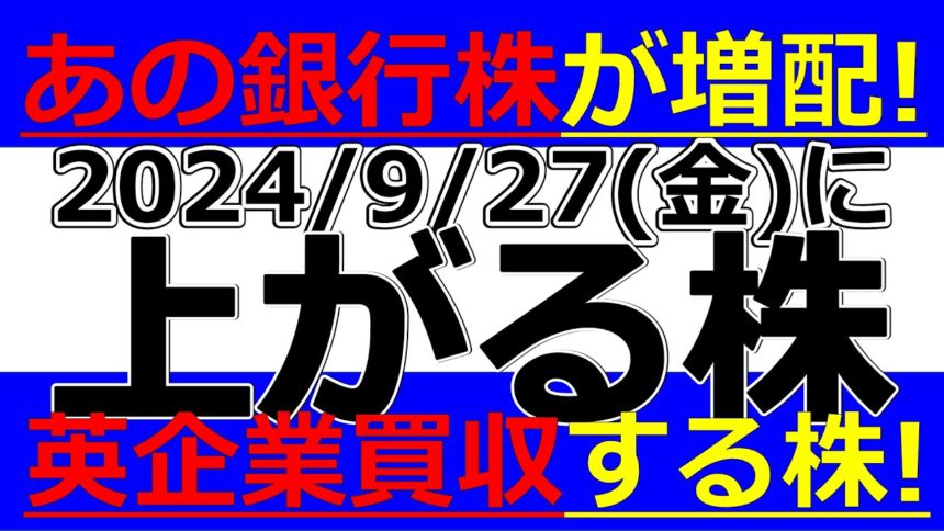2024/9/27(金)に株価が上がる株、株式投資・デイトレの参考に。あの銀行株が増配!英企業買収する株!