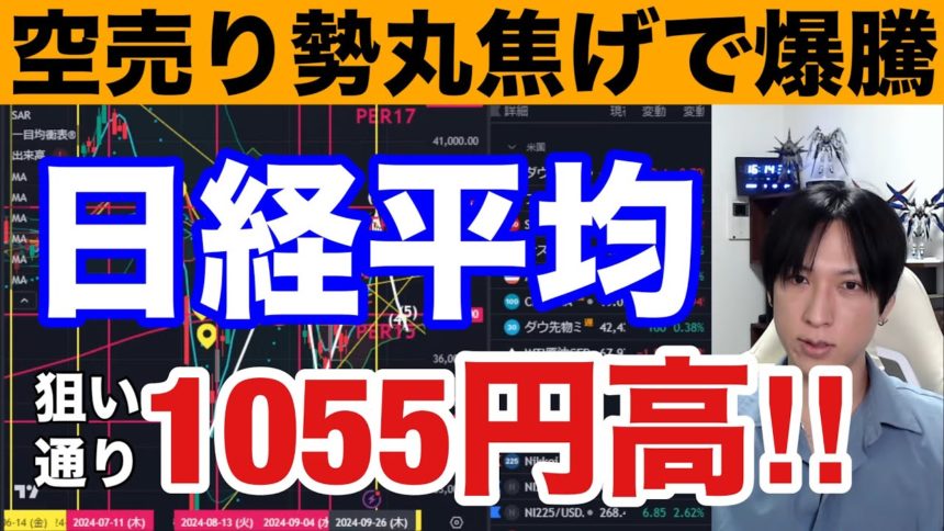 9/26、日本株爆上げ。空売り急増で日経平均1055円急騰。AI需要好調で半導体株爆上げ。円安再開でドル円145円。米国株、ナスダック最高値更新来るか。中国株、欧州株、仮想通貨BTCも強い