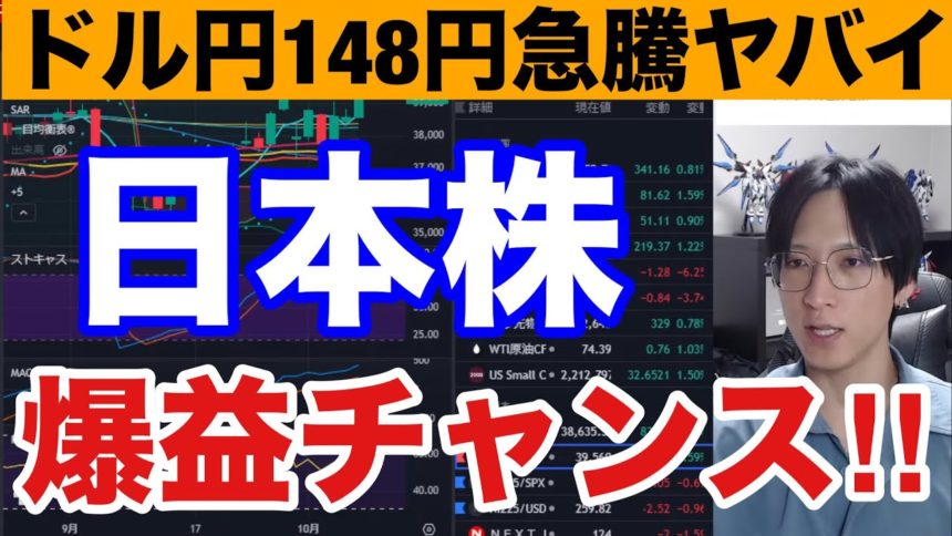 10/5、日本株爆益チャンス‼️雇用統計通過でドル円148円に急騰→日経先物900円高。円安関連銘柄爆上げ来い‼️米国株、ナスダック、半導体株も強い。仮想通貨BTC上昇