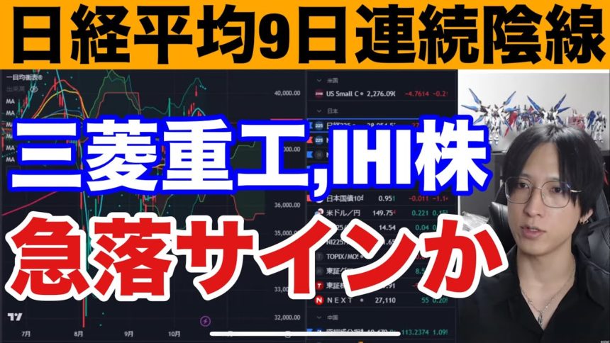 10/21、三菱重工、IHI株が急落。日本株動くサインか。日経平均9日連続陰線で弱すぎる。半導体株は上昇。投売り銘柄動くか。ドル円149円台。米国株、仮想通貨BTC、金先物強い。