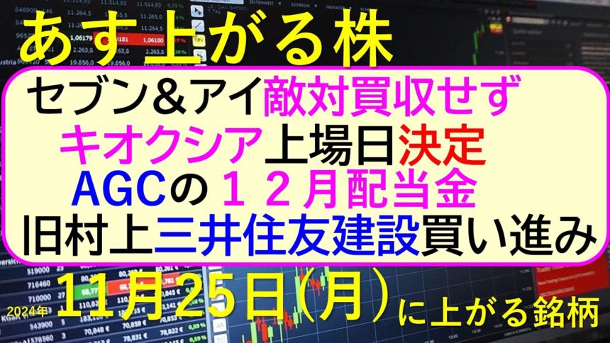 今日の引け後に出た材料で、週明け11/25(月)に期待できる銘柄。キオクシア上場日決定。セブン&アイ、敵対買収せず。旧村上が三井住友建設買い進み。AGCの12月配当金。~あす上がる株。最新の日本株情報。高配当株の株価やデイトレ情報についてもお話しいたします。