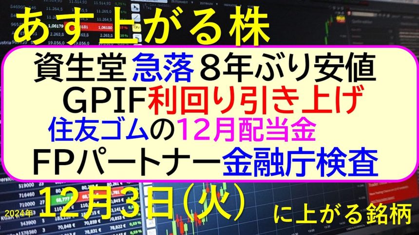 あす上がる株 2024年12月3日(火)に上がる銘柄。資生堂が8年ぶりも安値に。FPパートナー、金融庁調査でストップ安。GPIF期待。住友ゴムの配当~最新の日本株情報。高配当株の株価やデイトレ情報~