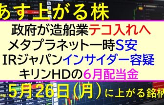 5. あす上がる株 2025年5月26日(月)に上がる銘柄。政府が造船業テコ入れへ。メタプラネット一時S安。IRジャパンにインサイダー容疑。キリンHDの配当~最新の日本株情報。高配当株の株価やデイトレ情報~