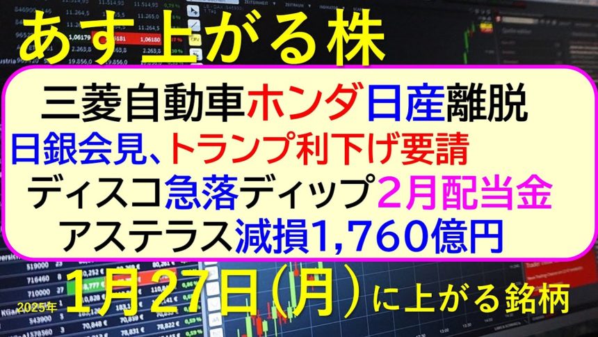 あす上がる株 2025年1月27日(月)に上がる銘柄。日銀会見。トランプ氏利下げ要請。アステラス下方修正。三菱自、ホンダ・日産離脱離脱。ディスコ急落~最新の日本株情報。高配当株の株価やデイトレ情報~