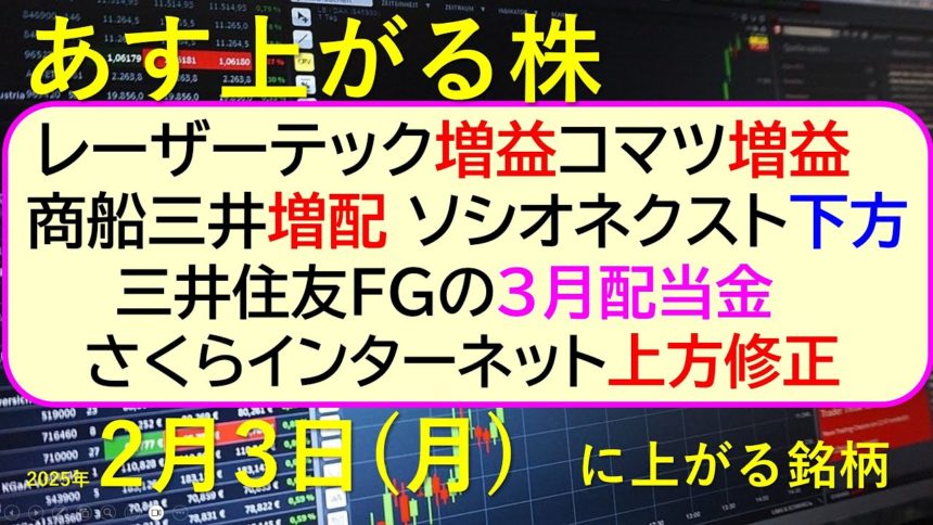 今日の引け後に出た材料で、週明け2/3(月)に期待できる銘柄。レーザーテック増益、コマツ増益、商船三井増配、ソシオネクスト下方、さくらインターネット上方修正の決算。三井住友FGの3月配当金