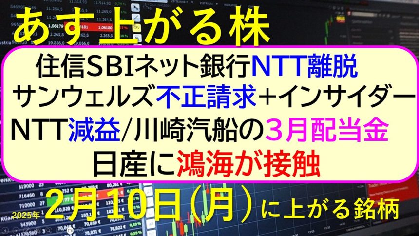今日の引け後に出た材料で、週明け2/10(月)に期待できる銘柄。NTTが住信SBIネット銀行離脱。サンウェルズ不正請求に加えインサイダー疑惑。日産に鴻海が接触。NTT減益。川崎汽船の3月配当金。
