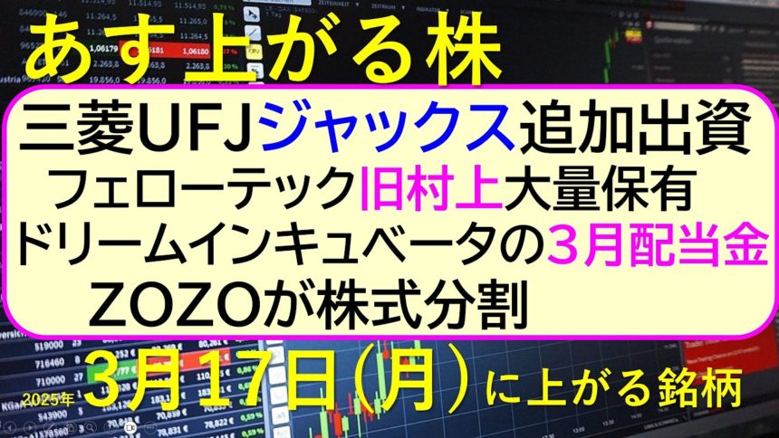 三菱UFJがジャックスへ追加出資。旧村上がフェローテック大量保有。ZOZOが株式分割。ドリームインキュベータの3月配当金。