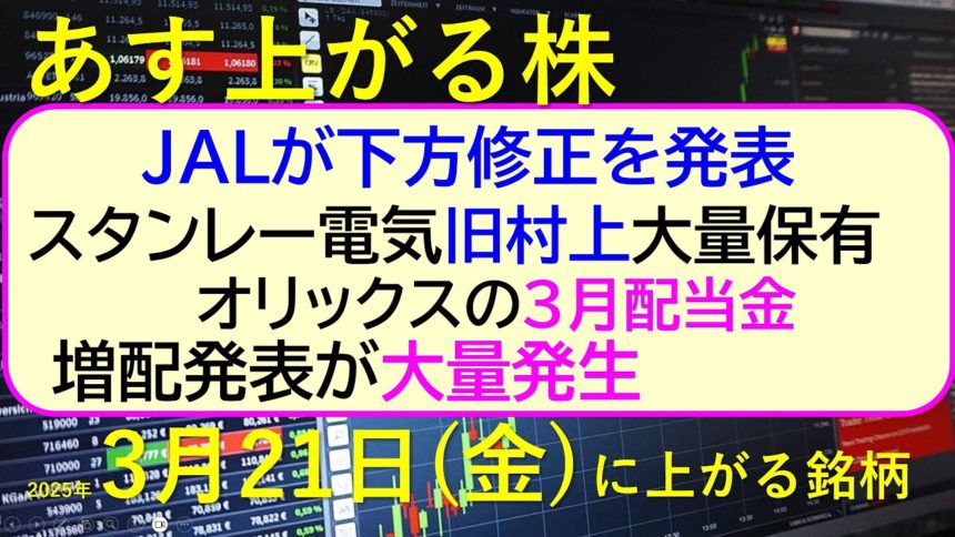 JALが下方修正。旧村上がスタンレー電気を大量保有。増配発表が大量発生。オリックスの3月配当金。