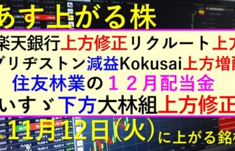 5. あす上がる株 2024年11月12日(火)に上がる銘柄。楽天銀行、リクルート、ブリヂストン、いすゞ、大林組の決算と株価推移。住友林業の配当~最新の日本株情報。高配当株の株価やデイトレ情報~