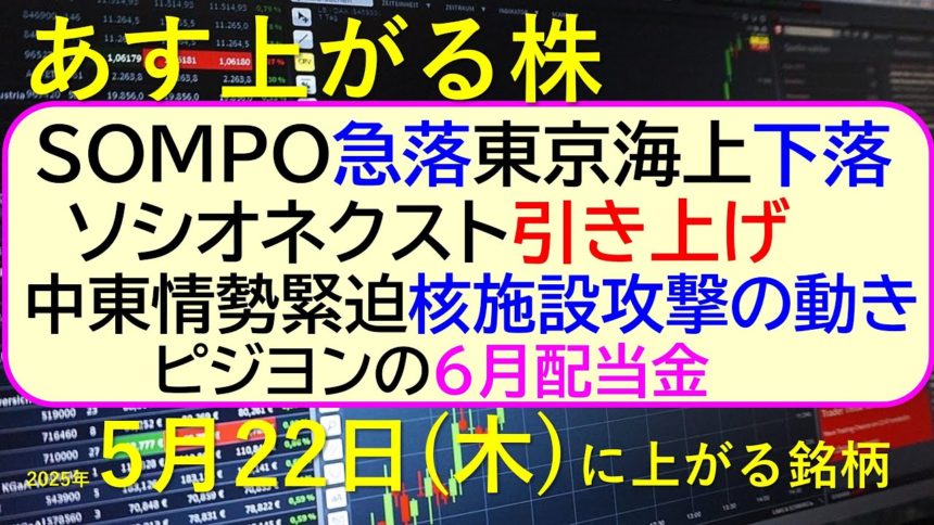 SOMPO急落、東京海上下落。ソシオネクスト引き上げ。中東情勢緊迫、イスラエルがイランの核施設攻撃へ。ピジヨンの6月配当金