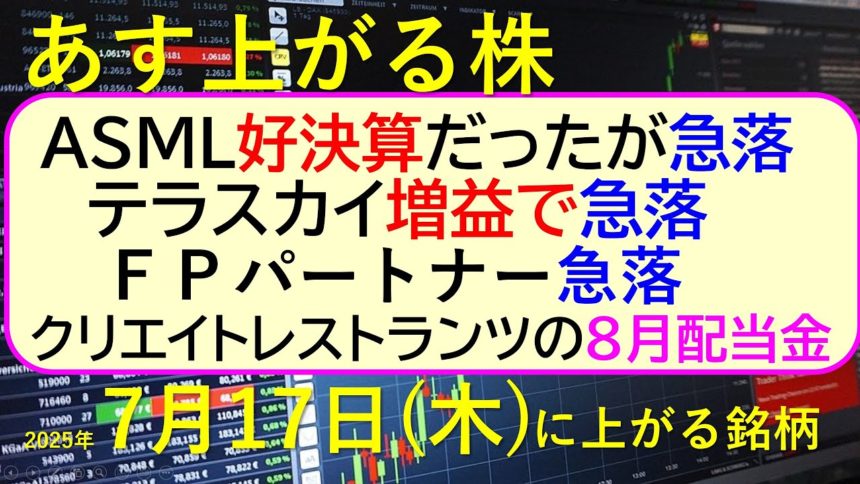 あす上がる株 2025年7月17日(木)に上がる銘柄。ASML好決算で急落。テラスカイ増益で急落。FPパートナー急落。クリエイトレストランツの8月配当~最新の日本株情報。高配当株の株価やデイトレ情報~