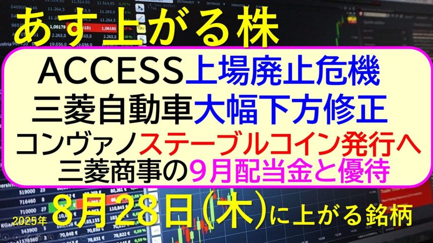 あす上がる株 2025年8月28日(木)に上がる銘柄。ACCESSが上場廃止危機。三菱自動車が下方修正。コンヴァノステーブルコイン発行へ。三菱商事配当~最新の日本株情報。高配当株の株価やデイトレ情報~