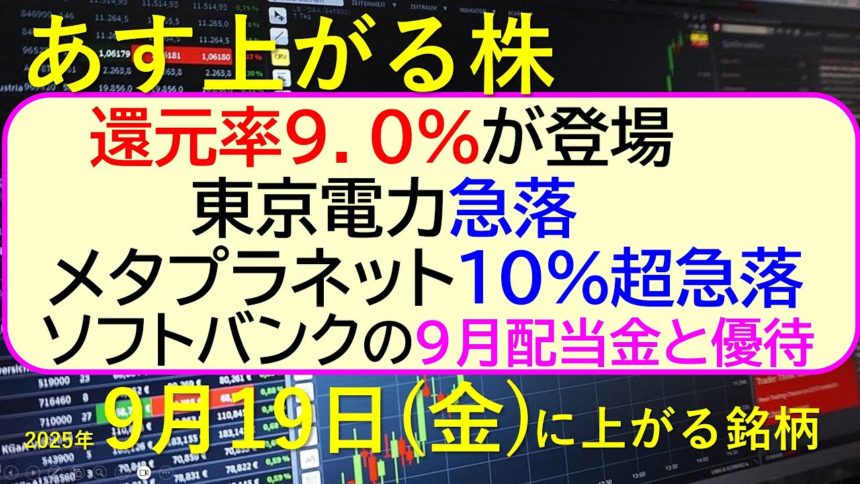 あす上がる株 2025年9月19日(金)に上がる銘柄。東京電力急落。メタプラネット10%超急落。還元率9.0%が登場。ソフトバンクの9月配当金と優待~最新の日本株情報。高配当株の株価やデイトレ情報~