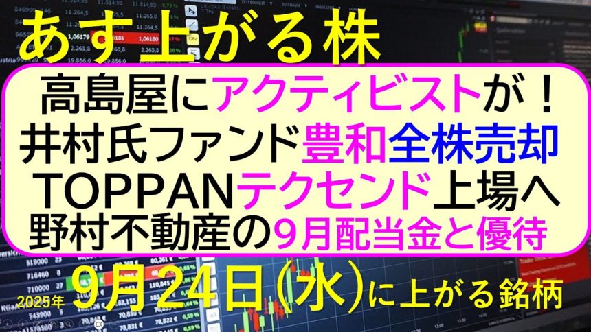 高島屋にアクティビストが!井村氏ファンドが豊和全株売却。TOPPANがテクセンド上場へ。野村不動産の9月配当金と優待