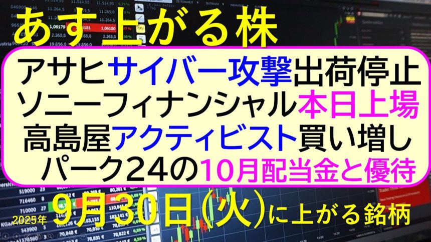 あす上がる株 2025年9月30日(火)に上がる銘柄。アサヒ、サイバー攻撃。ソニーフィナンシャル本日上場。高島屋アクティビスト買増。パーク24配当~最新の日本株情報。高配当株の株価やデイトレ情報~