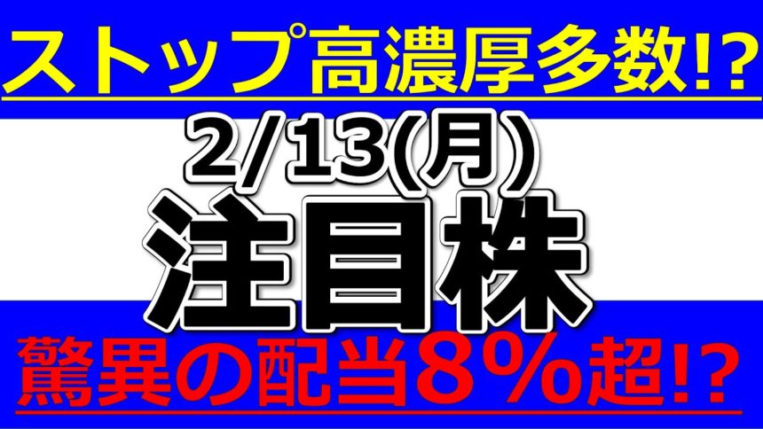 ストップ高濃厚多数!?驚異の配当8%超!?【2月13日(月)の注目銘柄まとめ】本日の株式相場振り返りと明日の注目銘柄・注目株・好材料・サプライズ決算を解説、株式投資の参考に